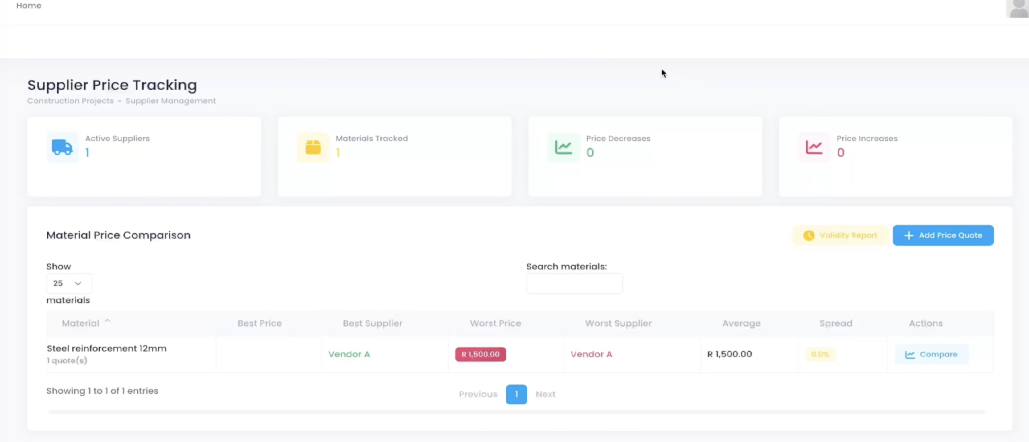Supplier price tracking page. One active supplier. One material tracked.