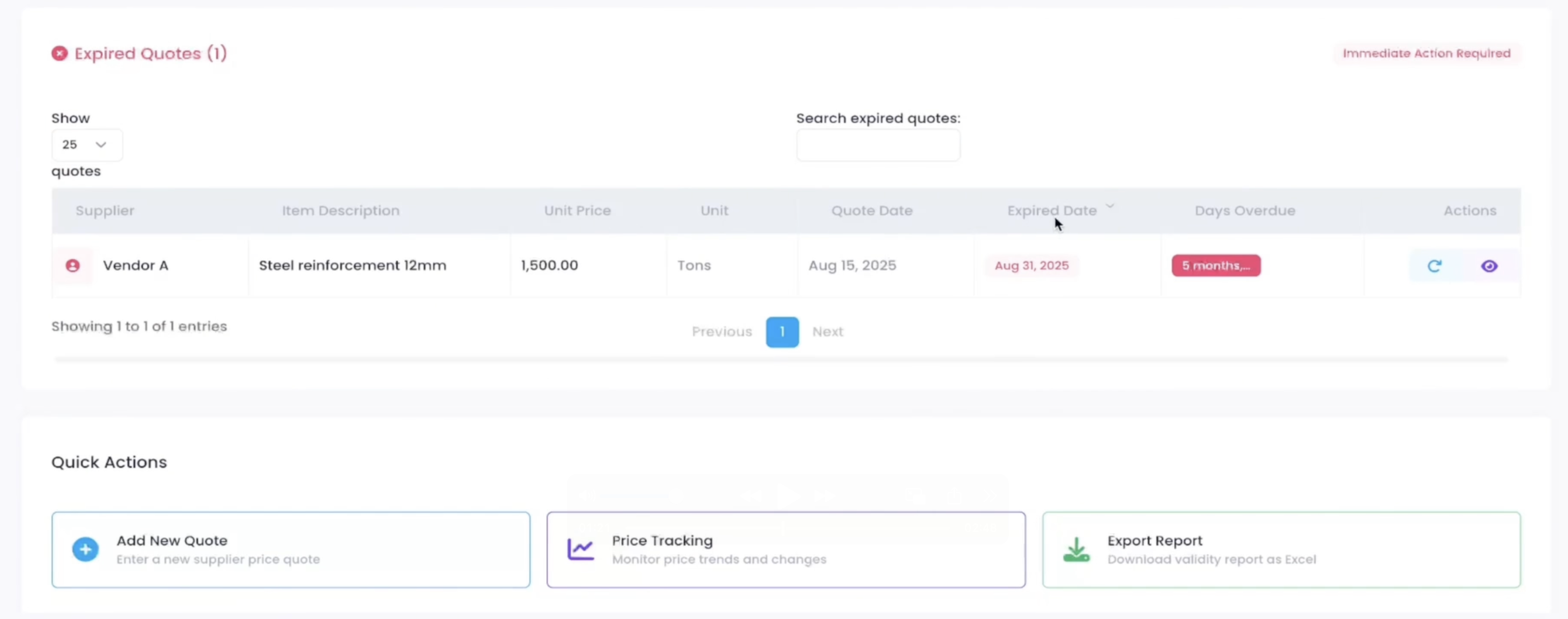 Below, the list. Vendor A, 12mm steel reinforcement. 1,500 per ton. Quoted August 15. Expired August 31. Today, five months overdue.