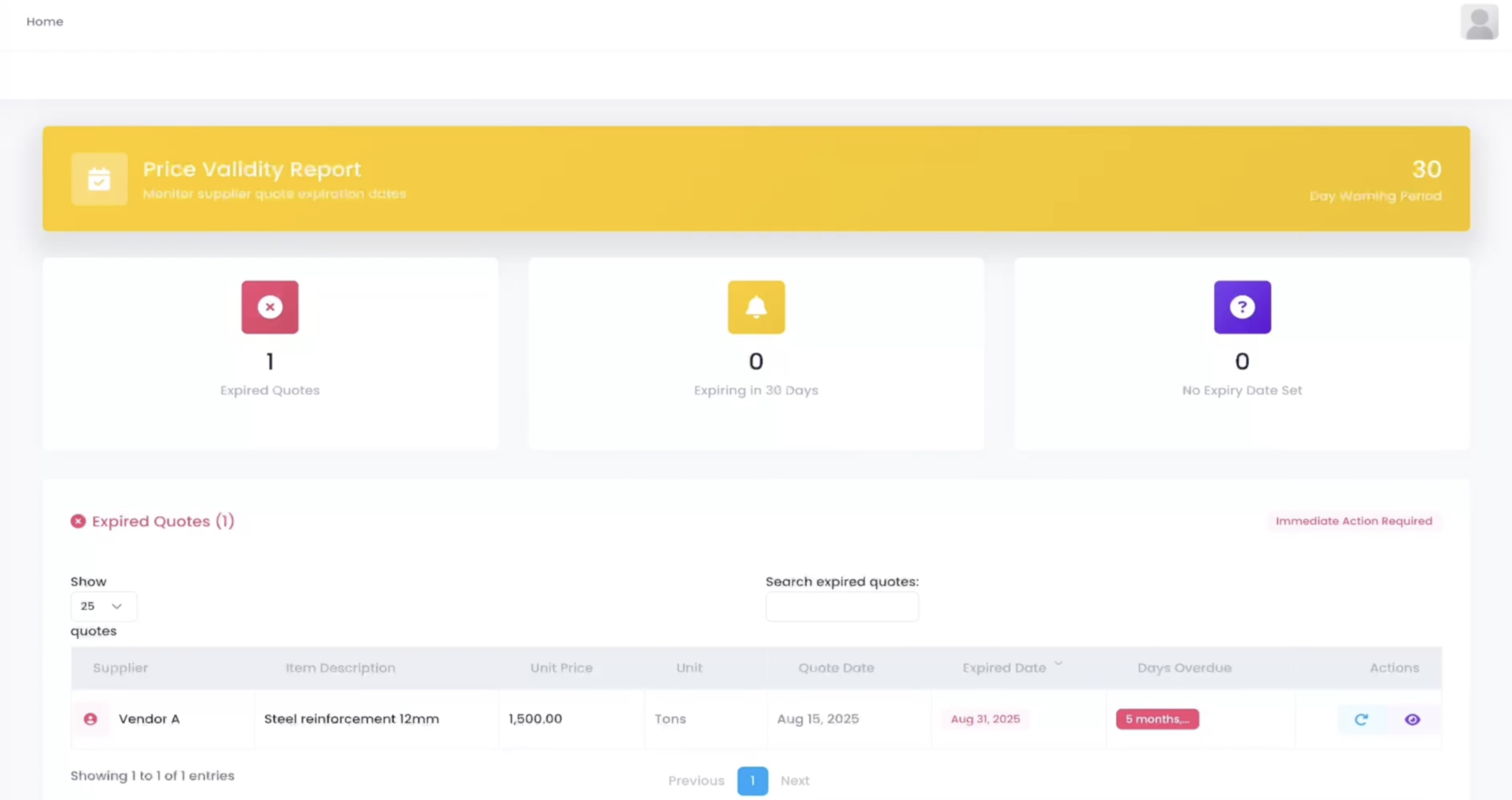 One expired quote. Zero expiring in 30 days. Zero with no expiry date set.