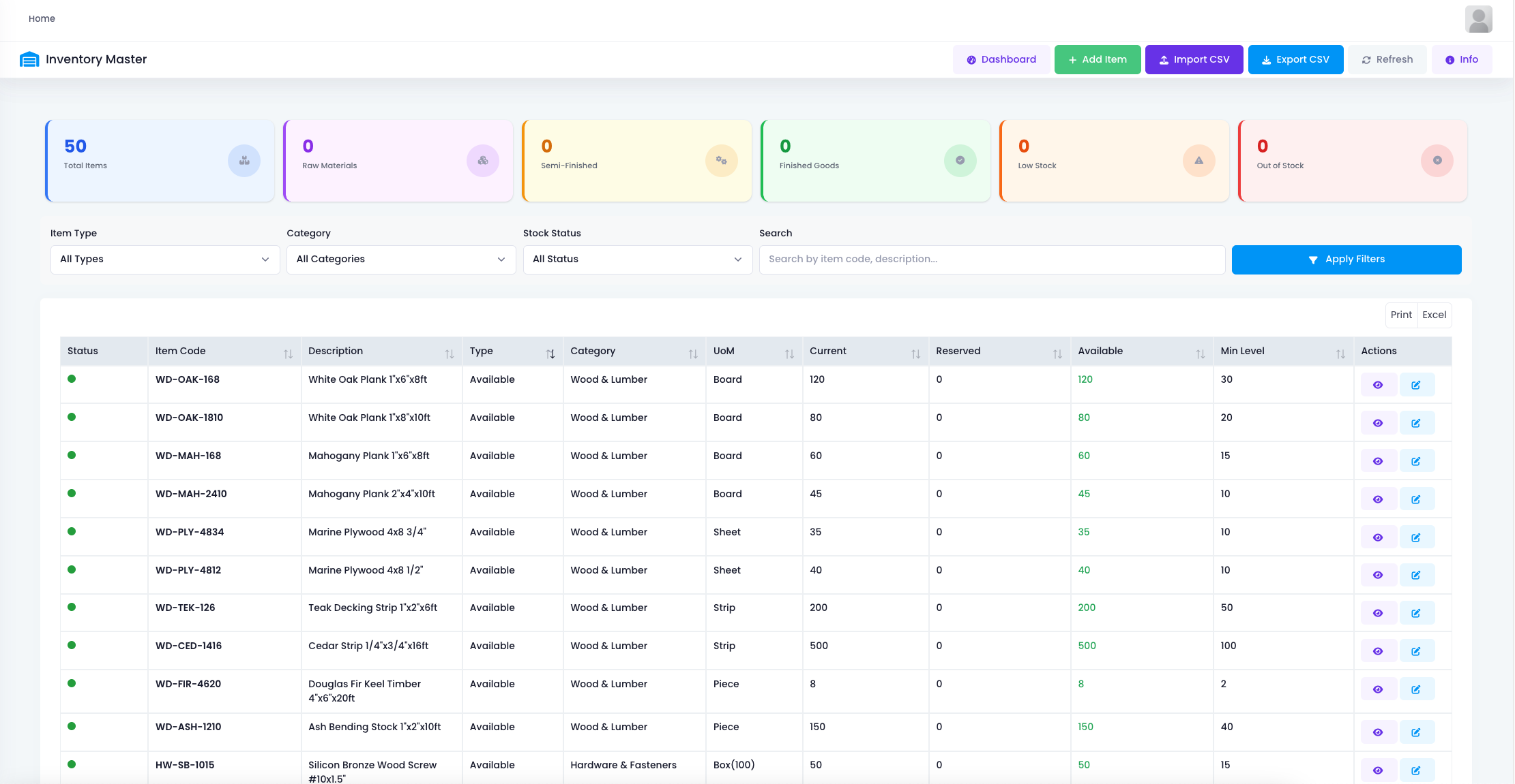 Each row shows not only current stock but also reserved quantity, available quantity, and safety stock levels. Take white oak planks: stock 120, available 120, safety stock 30. Bronze wood screws 50 boxes, available 50, safety stock 15.