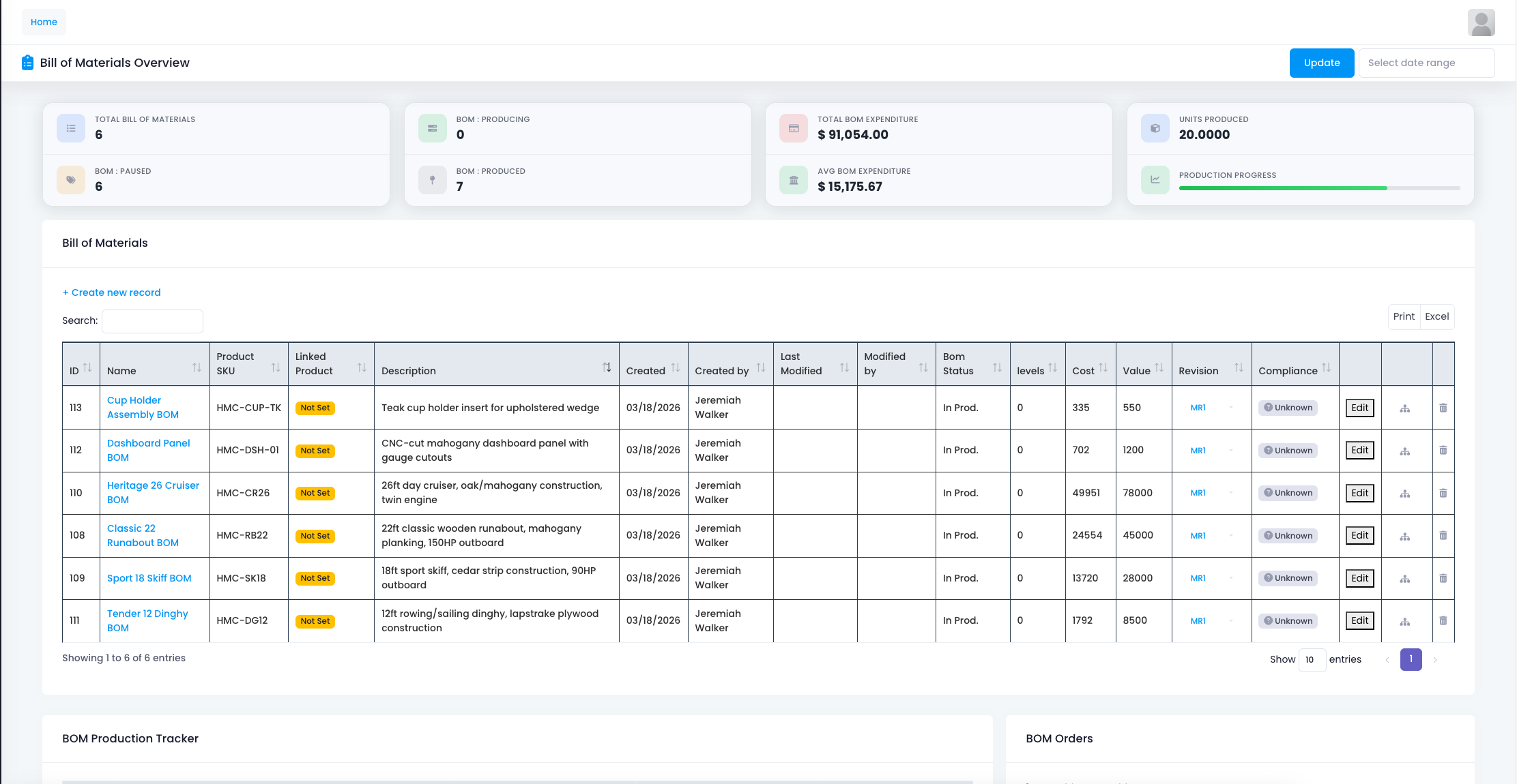 The BOM overview page centralizes six bills of materials, covering products from cup holder assemblies to a 26 foot cruiser.