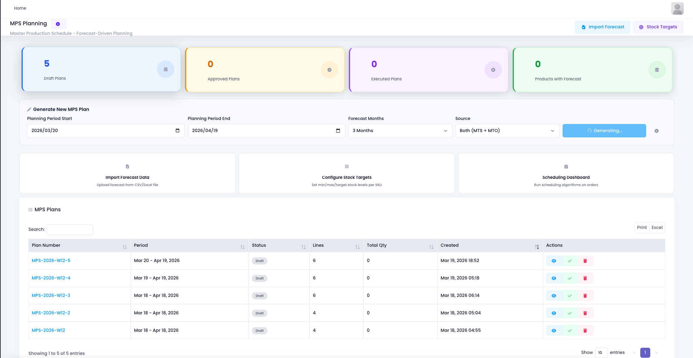 The MPS planning page organizes production for the coming month. Currently, five draft plans span from March 18 to April 19.