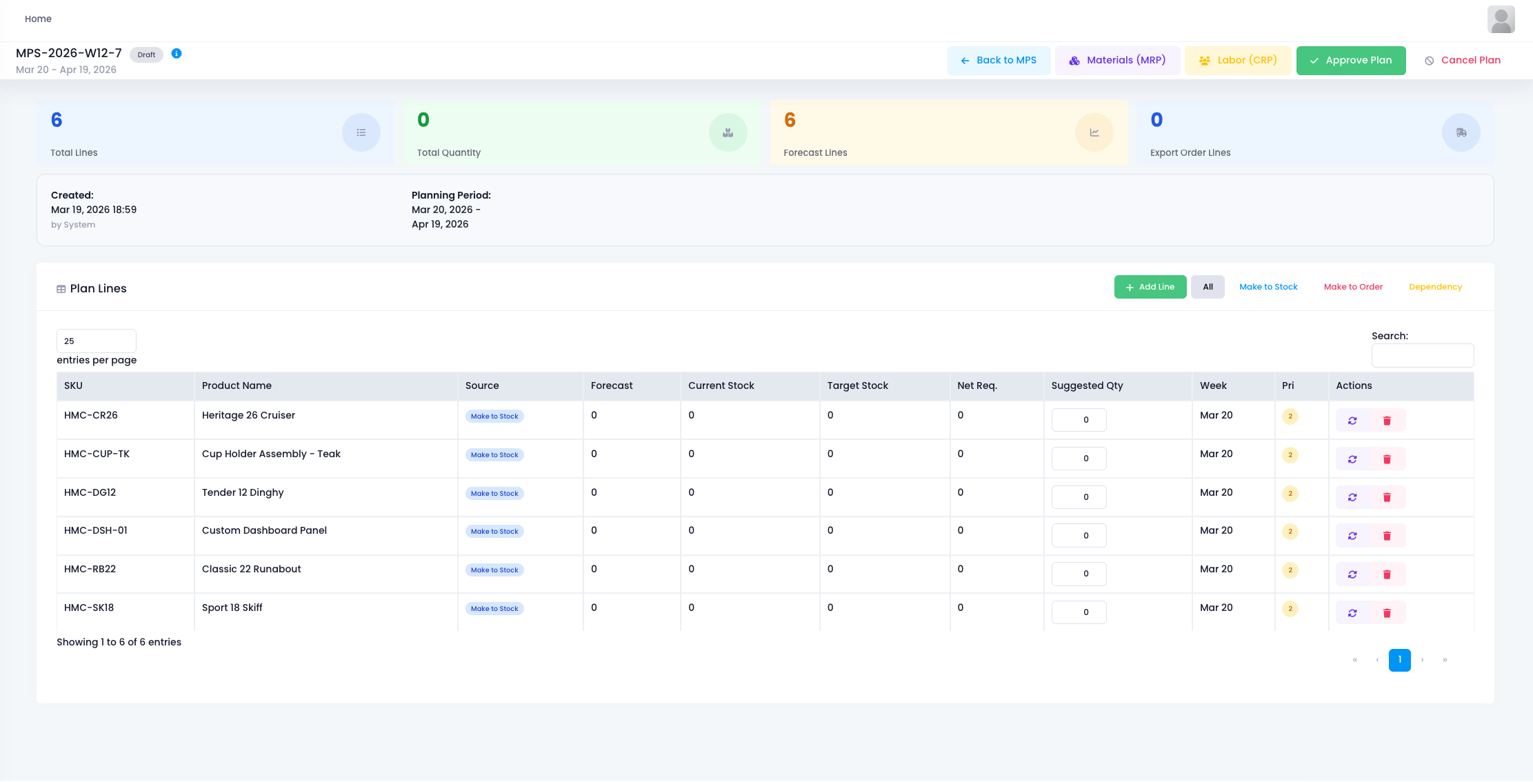 Click into any plan. The detailed view appears. Six products line up, each showing SKU, product name, demand source, forecast, current stock, target stock, net requirement, suggested quantity, planned week, and priority.