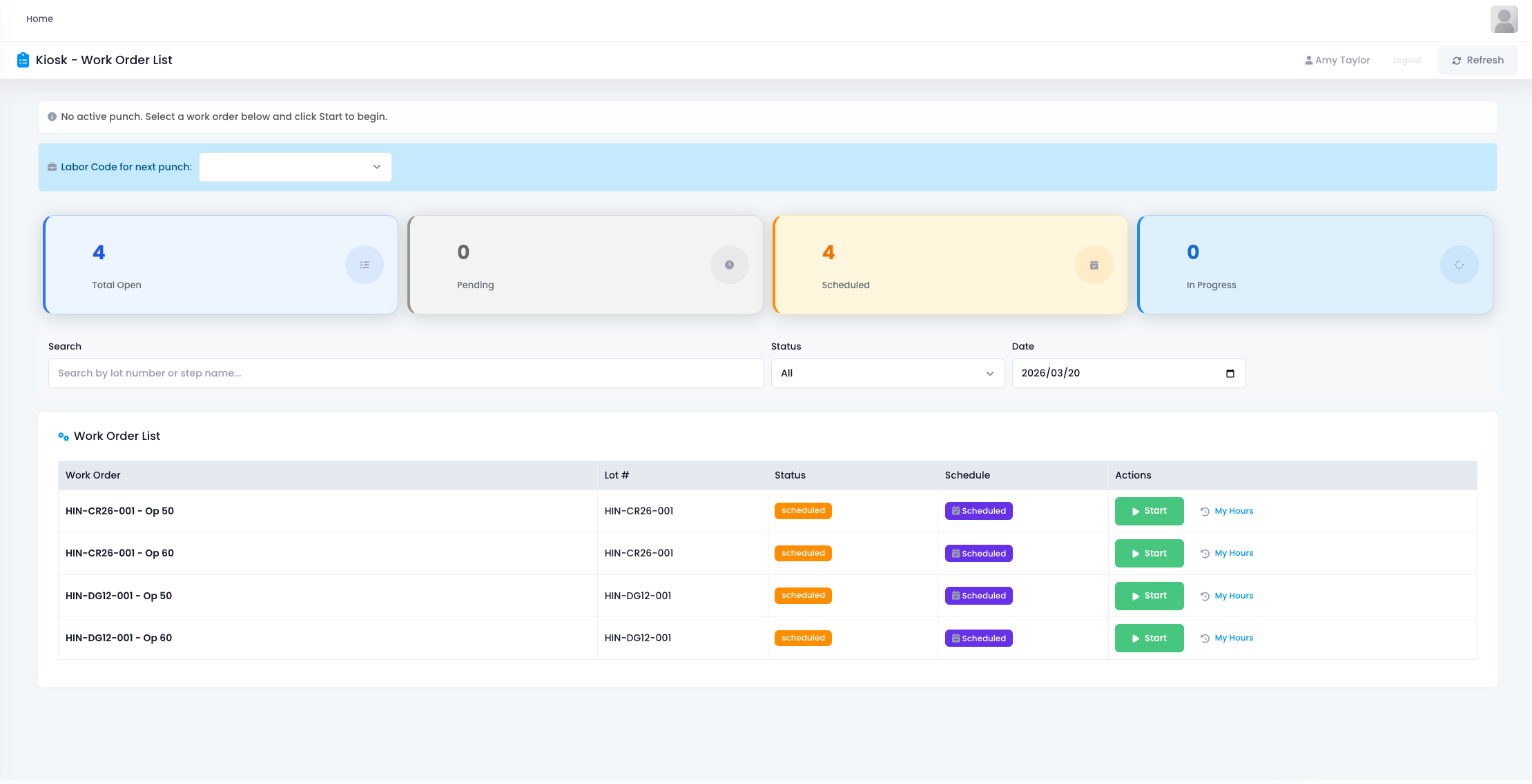 The shop floor terminal interface is designed for front line workers. After login, they see today's assigned work orders directly.