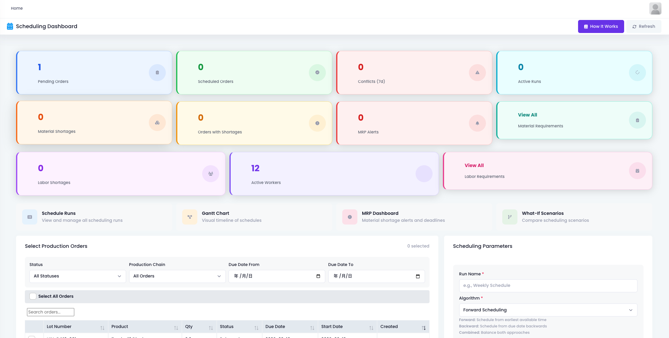 The scheduling dashboard aggregates key metrics at the top: one pending order, zero scheduled orders, zero material shortages, 12 active workers, zero MRP alerts.