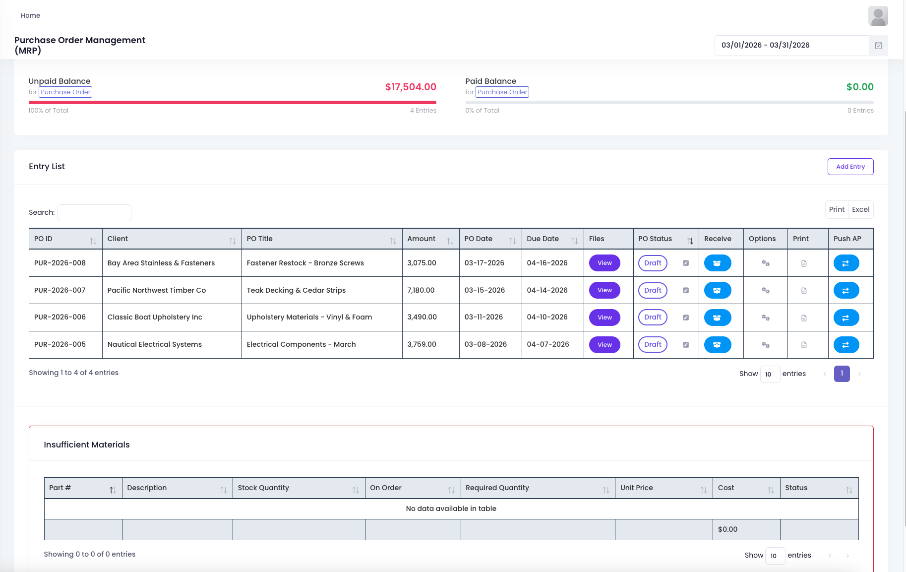 The procurement management interface clearly displays four open orders, covering fasteners, decking materials, upholstery fabrics, and electrical components. Total outstanding amount is $17,504.