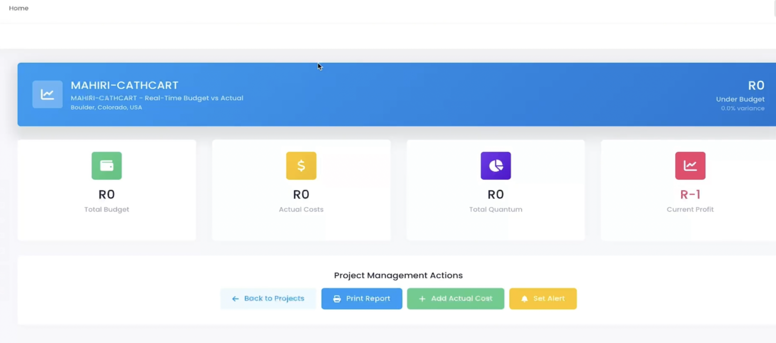 Entering a project detail page (e.g., MAHIRI-CATHCART), the system provides a "Real Time Budget vs Actual" dashboard displaying: