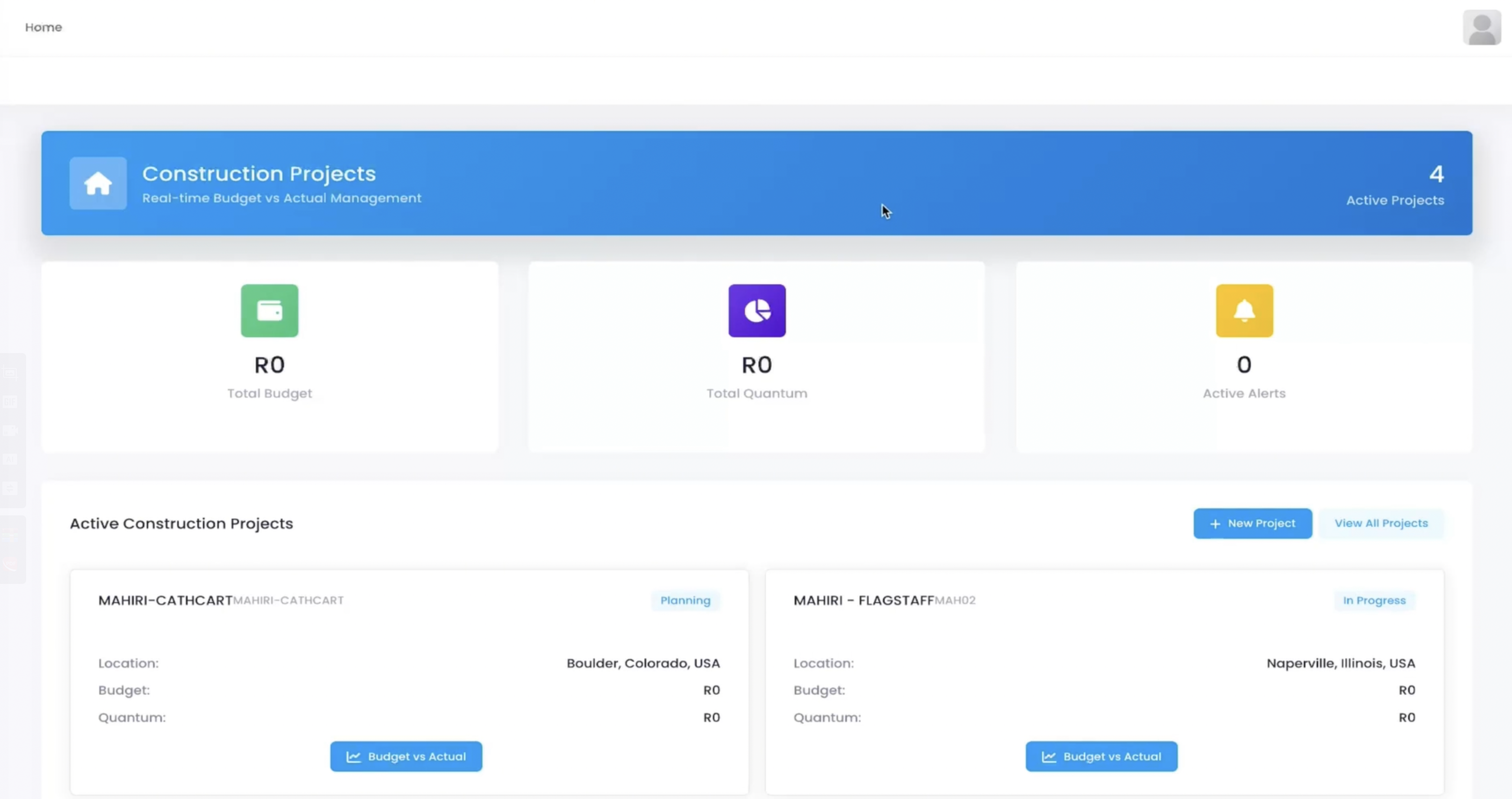 In the "Active Construction Projects" list, all active projects are displayed as cards, each showing current status (Planning / In Progress), location, budget, and quantum. Click the "Budget vs Actual" button to dive into detailed comparisons and quickly assess project health.