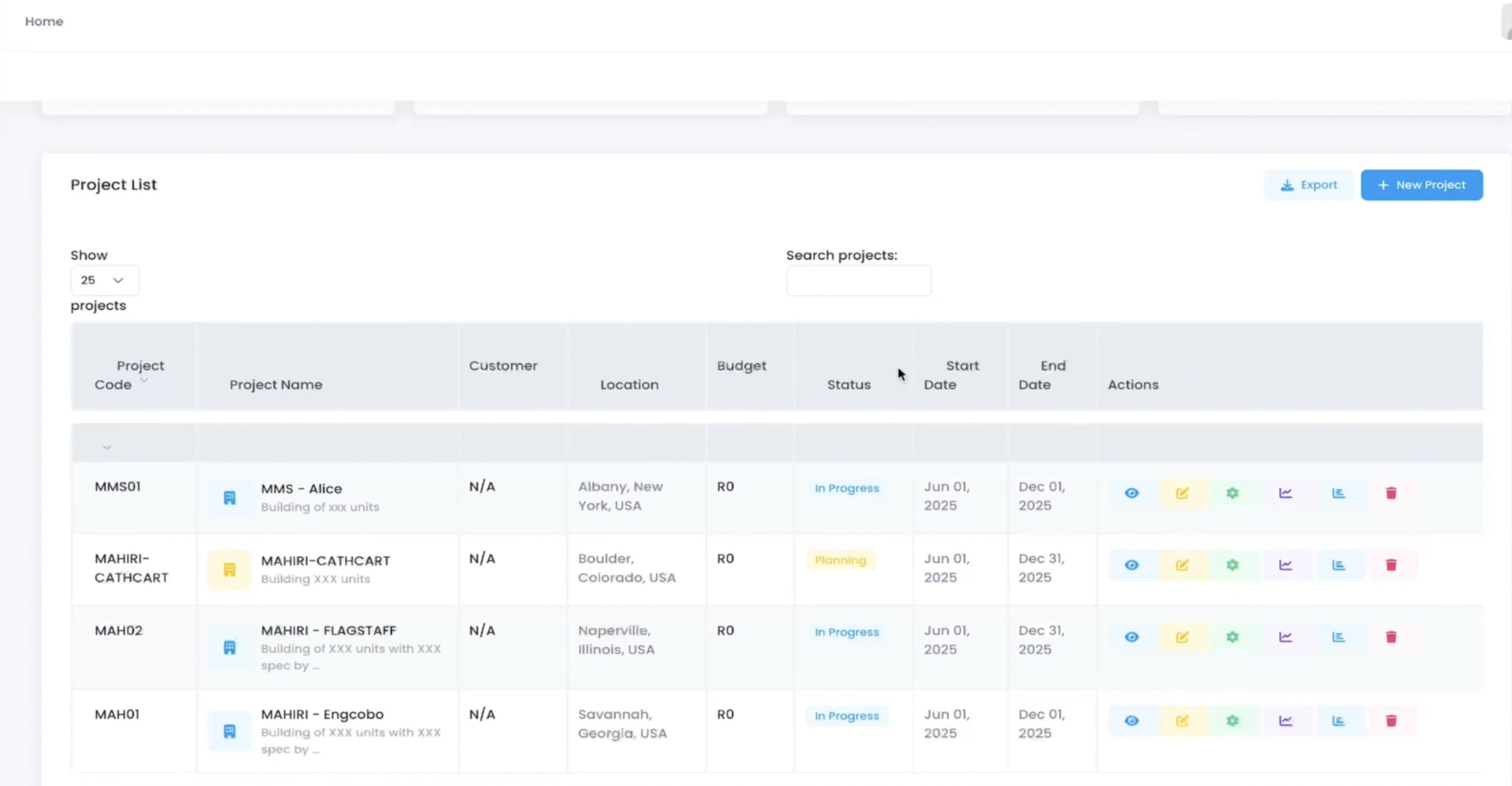 Project Names: MAHIRI-CATHCART (Planning), MAHIRI-FLAGSTAFFMAHO2 (In Progress), etc.