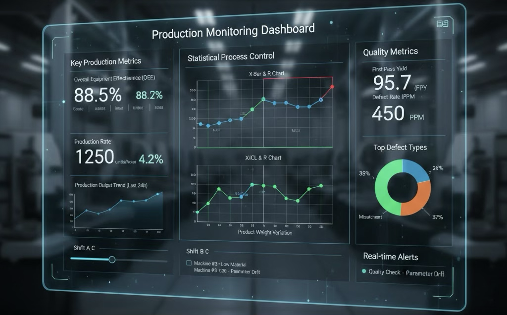 Manufacturers need tight coordination between production, quality, and equipment. Modular ERP, through modules like MES, SPC, and QMS, connects shop floor data with back end systems. Managers can view key metrics on dashboards in real time: Overall Equipment Effectiveness (OEE), Statistical Process Control charts, defect rates, and more.