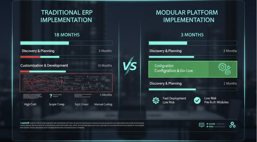 This design transforms implementation from "custom development" to "configuration activation". Traditional ERP often takes 18+ months to go live, while modular platforms can typically be deployed within 3 months.