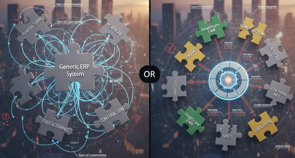 Industry specific systems solve customization issues but introduce new troubles: functional silos, integration difficulties, and high vendor risk. When companies need to expand, they often find themselves trapped in systems that cannot grow.
