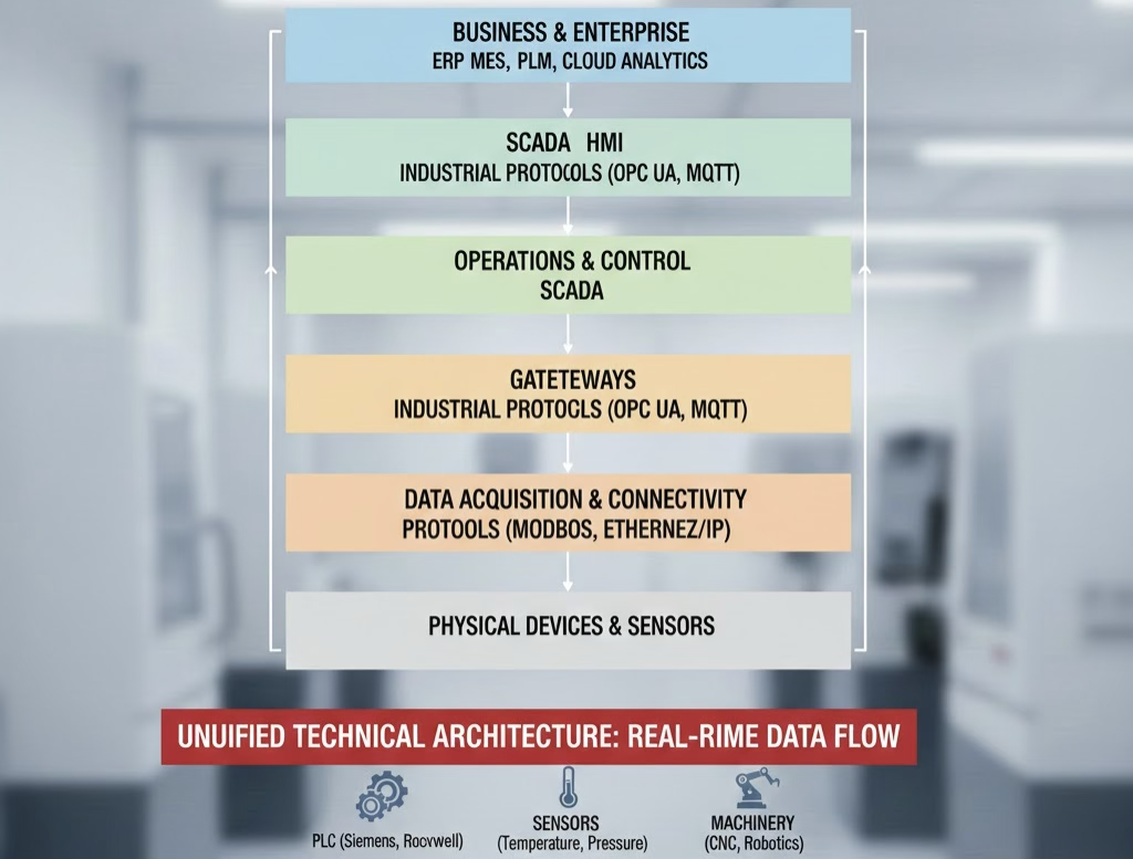 Enterprise Layer: ERP, MES, PLM, cloud analytics platforms leverage data for business decisions.