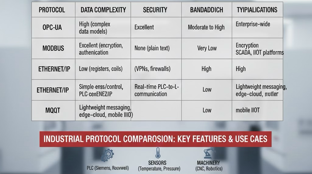 Support for OPC UA (enterprise interoperability, strong security), MODBUS (legacy devices), EtherNet/IP (real time control), and MQTT (lightweight IoT). New and old equipment alike can join the digital ecosystem.