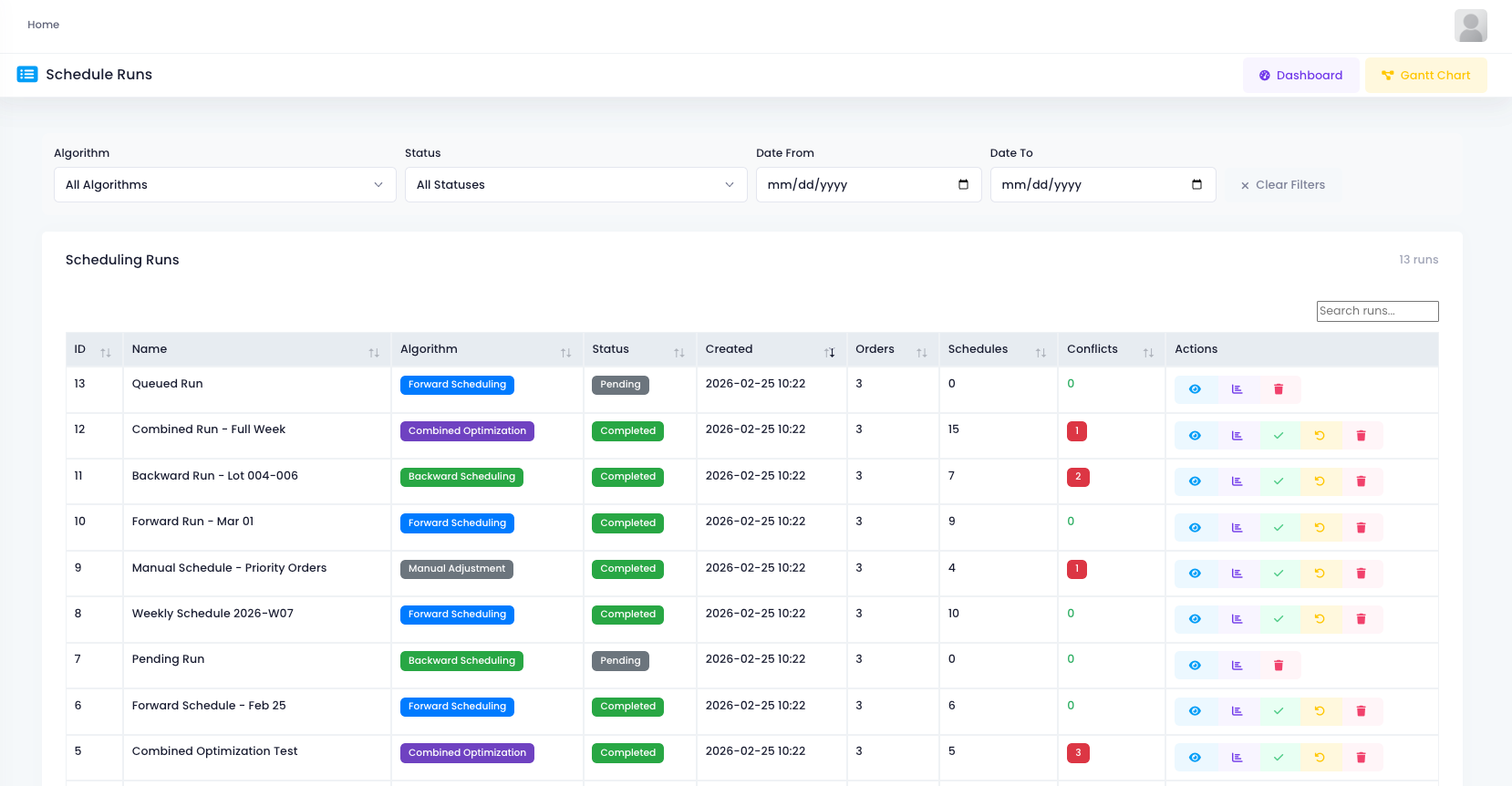 This is the schedule runs page. Every time you run scheduling, the system keeps a record.