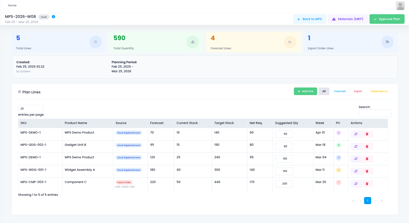 5 plan lines, total requirement 590 units. 4 from forecasts, 1 from an export order.