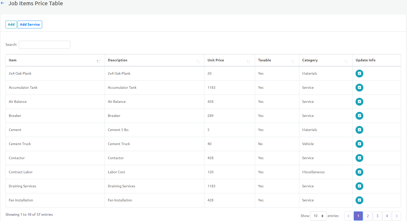 Utilize the database or catalog containing information on the costs, prices, and details of various service-related items, materials, equipment, and services you provide to your customers.